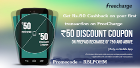 Freecharge Promo code can be used to get cashbacks on your phone bills, Mobile Recharges and DTH recharges. We update the Promo Codes Regularly so that you can save the most. Get the best Freecharge offers from here. Get Rs.50 Cashback on your first transaction on FreeCharge. Use promocode R5LPOHM . 100% Working Offer Download now - FreeChare Here